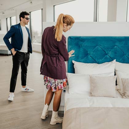 Bei der Stoffauswahl stehen wir Ihnen beiseite und helfen mit unserem Know-How, welcher Stoff zu welchem Rückenteil und welche Füße zur richtigen Einstiegshöhe führen. Et voilá - Ihr Bett ist konfiguriert!
